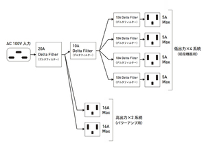 また構造上のもうひとつの特徴は、1コンセント1フィルターとしてそれぞれをアイソレートしていることである。従って結線は1点から放射状に分岐させたスター型で、コンセント同士のアイソレートに加えてパーツ間の相互干渉も排除する仕組みとなっている。