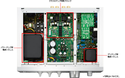 一方、今回もクラスDアンプとしては電源部への配慮が際立っている。プリ部とパワー部にそれぞれ専用電源トランスを配し、シールドと振動対策を徹底。筐体の制振と併せて、下位モデルとの違いは小さくない。そのほかプリ、パワー、電源の各ブロックを独立させた3分割シャーシも継承。奥行きを抑えた外寸ながら重さは18kgを超え、凝縮した作りの良さが目を引く。