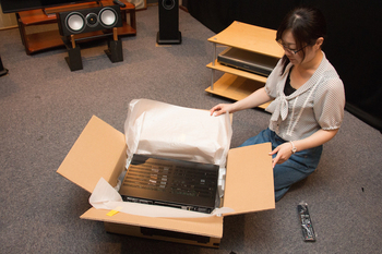 まずは開梱。そもそもAV機器を開梱するという行為に慣れていない伊藤。AVR-X1200Wの電源ケーブルをコンセントに接続し、HDMI端子でテレビと繋ぐ。試聴室には、小澤が5.1ch分のスピーカーとスピーカーケーブルを事前に用意しておいた。