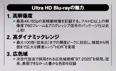 映像のパッケージソフトに未来があるとすれば、その筆頭候補がUltra HD Blu-ray(以下UHD BD)であることは疑う余地がない。それ以外の選択肢が見当たらないという消極的理由ではなく、映像メディアがたどるべき進化の道筋を的確に指し示した規格であることがその根拠だ。画質を決める3要素、すなわち解像度、色域、コントラストをバランス良く改善しつつ、既存のBDとの連続性も確保する。