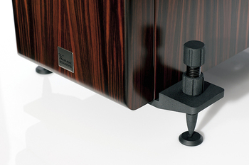 以前の「T3」では、ウーファーをエンクロージャー下辺の近くにセットしていた。その時の配置では、ボトム・ウーファーとミッドレンジ・ウーファー間の距離が離れ、上下方向の音像定位に隙間があると感じられる傾向があった。一方で新しい「シンフォニー・エディション」では、3基のウーファーが等距離で取り付けられており、定位が乱れる心配はなくなっている。脚の部分も高さの微調整が可能となり、スパイク自体と取り付け金具の強度が増している。