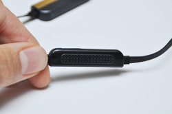 「使いやすさ」の要素として、NFCによるワンタッチペアリングにも対応。左側イヤホンケーブルのインラインにあるマイク付リモコンにNFCタグを内蔵し、NFC対応のスマートフォンを近接されるだけでBluetooth接続ができる。リモコンは3ボタンタイプで、スマホやタブレットとの組み合わせでは音楽の再生停止やボリューム、曲送りのほかハンズフリー通話の操作に対応。曲送りは+/ーボタンの長押しで対応するので誤操作も少ない。iOS/Android両方の端末で快適なリモコン操作ができる。