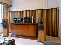 ここでは手始めに〈シルヴァン〉と〈アンクIV〉を、AA試聴ルームに設置してみよう。まず、何も音響材を置かない「素」の状態だと、部屋のクセが強くでてしまう。ギターが硬く声を張るときつい。ビッグバンドはダンゴ状だ。