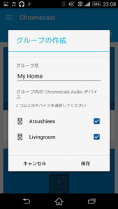 1台目のセットアップと同じ手順で、2台目のChromecast AudioをWi-Fiネットワークに参加させると、Chromecastアプリの「デバイス」タブに2台の機器が並ぶ。メニューから「グループの作成」を選んでグループ化したいデバイスを設定。新規グループに名前を付ける。