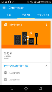 「ミュージック」アプリなどで音楽をキャストする際、先ほど作成したグループを選択すれば、同時に2台のChromecast Auidioにつないだ機器から同じ音楽が流れる。