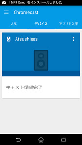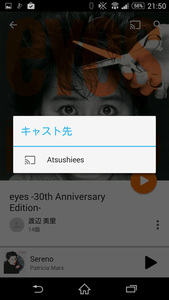 音楽の再生方法はとても簡単で、Chromecastと同じようにGoogle PlayミュージックやTuneinなど「キャスト」に対応するアプリから、アイコンをタップしてストリーミング先にChromecast Audioを選ぶだけ。Xperiaにプリインされた「ミュージック」アプリからもキャストができた。