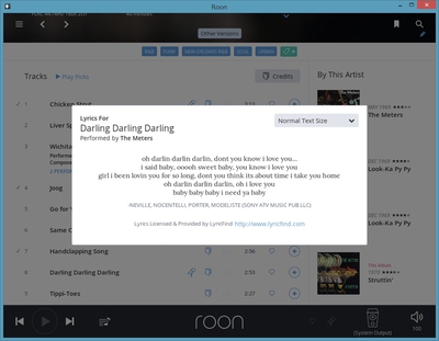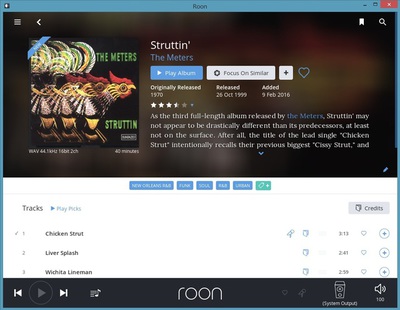 Roonによって情報が付加することができた各アルバムを見てみよう。The Metersの『Struttin’』を選択すると、下記のようなアルバムページが開く。
