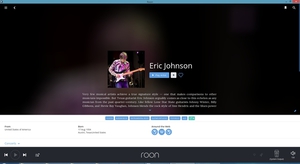 画面下部にある「Followed By」に注目。ここでは該当アーティストのフォロワーを紹介している。Roonによれば、Eric Johnson は、Jeff Beckのフォロワー(影響を受けている)ということだ。そこで「Eric Johnson」を選択してみると、同じようにEric Johnsonのページがバイオグラフィと共に表示される。