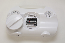 背面にはφ28mm×2基のスピーカーユニットを搭載しています。電源は単四電池3本で、だいたい25時間くらいの再生が可能。電池がなくても、iPhoneの電源を使って鳴らすことができます。