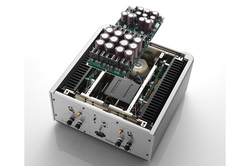 電解コンデンサーはチャンネルごとに4700μF×3パラレルでデュアルモノ構成。ダンピングファクターは1000という数値を達成している。出力部はGrandiosoシリーズのパワーアンプと同じく、瞬間34アンペアを誇る大型のバイポーラLAPTトランジスター。これを5パラレルでプッシュプルとした3段ダーリントン回路を構成。また、ドライブ段2段目から最終段への出力インピーダンスを下げ、電流供給能力を高める独自の回路「LIDSC」も特徴だ。