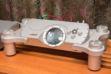 Mojoと並ぶかのように、昨年9月の東京インターナショナルオーディオショウでは、オーディオファイル向けの旗艦DAC/プリアンプ「DAVE」が登場した。その姿は、コラール・シリーズのサイズを踏襲し、中央にはCHORD独特の円形レンズを配置。サンプルレート・音量・DSD/PCMフィルター・位相などが表示される。右の4つのスイッチで、入力セレクトや各種モードなどが選択できる。そのスイッチの中央にあるステンレス・ノブでは音量調整が可能だ。今回から、ハイカレント型の駆動力の高いヘッドホンアンプも搭載された。この精密感に溢れた美しいデザインは、CHORDならではのものだ。
