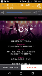 各チャンネルを選ぶと、画面の下には番組表のほか、現在の放送内容の詳細を表示する「NOW ON AIR」のメニューがある。番組表はまだプレ放送の段階だからか、かなりざっくりとした番組紹介になっている。流れている楽曲のタイトルが知りたくなって「NOW ON AIR」をタップしてみても、まだ放送の詳しい内容がここに表示されることもない。