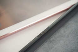 iPadとSmart Keyboardの接点は、今回のiPad Proシリーズから新しく導入されたインターフェースである「Smart Connector」だ。データとバッテリーの両方をやり取りする端子なので、従来のBluetooth対応のiPadキーボードのようにペアリングする手間がないし、バッテリーがなくなってキーボードを充電する煩わしさからも解放される。