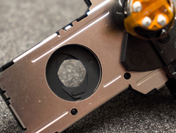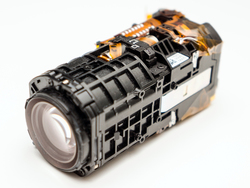 写真手前がAX55に搭載された手ブレ補正ユニット。光学ズーム倍率の向上に伴い光学系は大型化しているが、従来機のユニットに比べ軽量化を達成。本体の軽量化にも貢献している