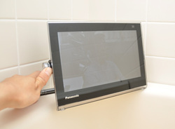 モニター側は本体がIPX6/IPX7相当の防水仕様なのでお風呂やキッチンなど水回り対策は万全なのだが、側面にあるフタを開けると充電用のmicroUSB端子にSDカードスロット、イヤホン端子が露出する。この中は防水仕様になっていないため、子供と一緒に入浴しながらテレビを見る時などには、うっかり開けることがないよう注意が必要だ。