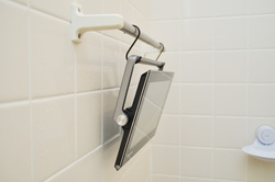 同様に湯船の中に長く浸けておくことはできないので、なるべくテレビを設置する位置は固定しておきたい。筆者宅の浴室はバスタブのコーナーにモニターを置けるスペースがなかったので、タオル掛けにS字フックを使って吊り下げスタイルで設置した。本体背面のハンドルは180度ぐるりと回転して4段階にポジションが設定できる。