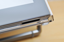 音声はモニター本体、ベゼルの下側に2つのスピーカーユニットから出力された音をアクリル素材のフレームに反射させて前方に広げるデザインとしている。指向性が少し狭いが、モニター本体の向きが簡単に変えられるので、キッチンやお風呂で使うことを前提に考えれば必要十分な仕様と言える。