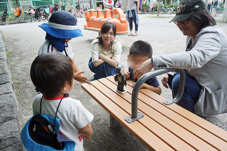 一条氏は「とりあえずロボホンを置いて様子を見てみましょう」とベンチに座り、あたりを伺う。子供たちと適度な距離を取り、傍らにロボホンを置いてみる。当たり前だが、子供たちは近づいてこない。