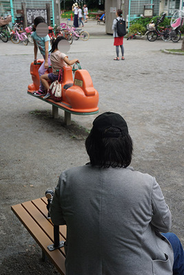 公園のベンチにたたずむ一条氏。少し距離が離れたあたりの砂場で、子供たちが遊んでいる。