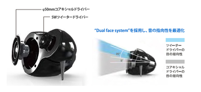 そしてその「ひょうたん」をぐいっと「捻って」、フルレンジとトゥイーターにはリスナーに向けてそれぞれ異なる角度が付けられている。エレコムはこれを「Dual face system」と呼称しており、こちらの狙いは音の指向性の最適化だ。