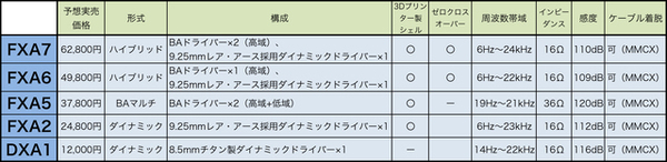 今回登場したのは、エントリーから順に「DXA1」「FXA2」「FXA5」「FXA6」「FXA7」の全5モデルだ。