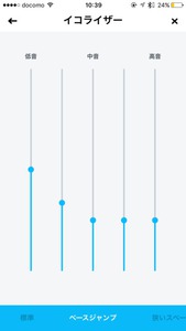 イコライジングは「標準」の他に、低音ブーストにあたる「ベースジャンプ」、ニアフィールド向けに広がりよりクリアな志向に振る「狭いスペース」、低音を大幅にカットする「音声」が用意される。そして5バンドの帯域別に調整もできる。夜中に聴くから低音を控えめにしたい、逆に大きな音が出せるところで大勢で楽しむからベースをフルに鳴らしたい、そんな要望もアプリのイコライザー機能が解決してくれるのだ。