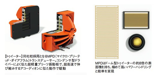 一見してまず目に付くのがトゥイーターだ。従来はリボン型だったのを、このシリーズではMPD(マイクロ・プリーテッド・ダイアフラム)とした。いわゆるハイルドライバーである。