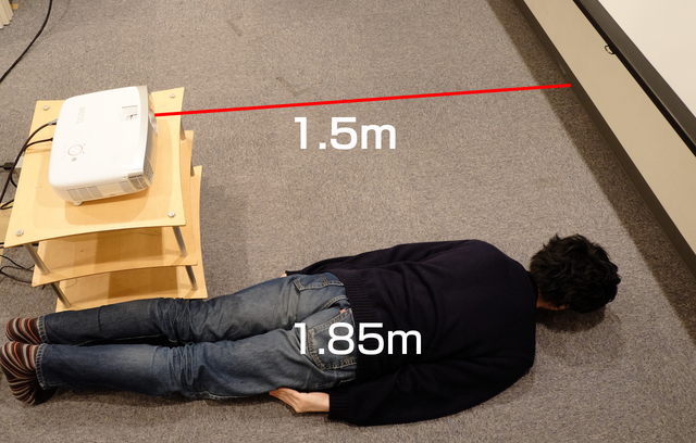 小難しいことはもういいと思いますので、ゲームします。「HT2150ST」を設置しますが、これはすごく簡単。まず、プロジェクターにはセレブのような広い部屋が必要と思われる方もいるかもしれませんが、技術の進歩はすさまじく、狭いスペースにポンと置いて100インチが映せます。