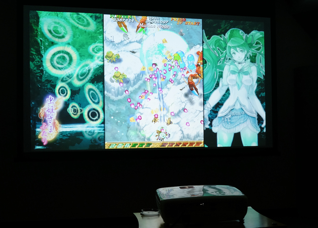 あと、会社にはスクリーンがあるので今回は使いますし、実際に使った方が良いのは間違いないですが、壁に映してもいけます。ちなみに、クリーム色っぽい壁でも良い感じに映せる「壁スクリーンモード」も搭載。各種設定は保存されるので、使わない時は片付けて、ゲームする時にはポンと置いて電源を入れたら使える。普通の部屋で大画面がこんな簡単に実現できる時代です。