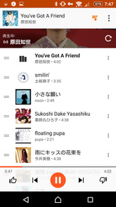 ただ、筆者はGoogle Play Musicのユーザーインターフェースがどうにも馴染みづらく感じてしまう。ホーム画面からアーティストをタップで選択してから楽曲リスト、楽曲の再生画面と深く入ったあとに、今度はホーム画面や音楽ライブラリに戻る操作が画面の上下スワイプや、左肩にある「←(戻る)」アイコンのタップなど混在しており、直感的に操作しづらい。