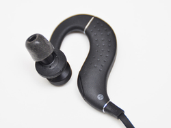 装着スタイルは前機種と同じ。イヤホン部は耳にイヤーフックで掛け、ケーブルを首の後ろに回すタイプだ。このイヤーフックは、オーダーメイド補聴器メーカーであるスターキージャパンと共同開発したもので、激しく身体を動かしてもイヤホンが外れたりせず、スポーツと音楽を心地良く楽しめるデザインと説明されている。イヤーピースはカナル型で、遮音性と音質をともに高めている点も前機種と一緒だ。