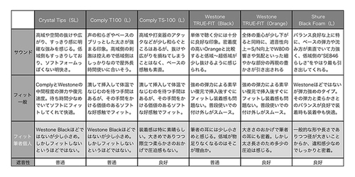 ただし、イヤーピースは結局ユーザーの耳との相性の良し悪しの問題がほとんどなので、どうしても「参考までに」という話になってしまう。くどくど詳細に違いを述べても「個人差の範疇」に埋もれてしまうだから、実寸サイズと同じくこちらも、一覧性重視の表でさっぱりとお届けしよう。