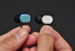 本体のデザインは耳に装着した際にノズルが耳穴に深くフィットするよう角度を付けた。ハウジングも外耳に自然と寄り添うように柔らかな丸みを帯びている。ハウジングの素材は樹脂で、フェイスプレートの一部にはアルミ素材を採用。AKGのロゴを配置して上質なルックスに仕上げた。イヤホン部のサイズをN20Uと比べてみると、やはりドライバーを2基積んだぶん厚みは増しているが、装着感はより快適になっている。
