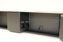 SoundTouch 300の基本は、たった1本の薄くコンパクトなバー。テレビの前に置く、それだけで完結する。外観はガラストップでパンチングメタルのグリルと、エレガントなイメージ。これまでのボーズ製品とは明らかにテイストが異なり、ヨーロッパや日本のユーザーを強く意識していると思えるものだ。