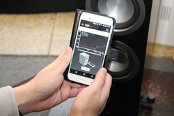 AUTO BLENDは、まず左右どちらかのスピーカー/サブウーファーの前、至近距離でiOS/Android端末をかざし、テスト音声信号を測定する。