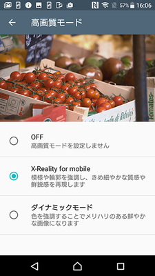 本機は画質モードとして、「X-Reality for mobile」「ダイナミックモード」「OFF」を備え、ワンタッチで切替ができる。まずは出荷設定の「X-Reality for mobile」を選択して行った。