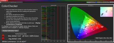 図中「CIE 1931 xy」の大きな三角形は人間が見る事のできる色の範囲で、内側の三角がRec.709の範囲を示している。その中で白い枠が測定のターゲット、色のついた丸印が実際の測定値をプロットしたもの。評価は中央のグラフ「DeltaE 2000」が指標になる。
