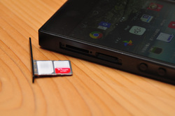 GRANBEATのDSDS機能は、4Gと3Gの回線を同時に待ち受けられる仕様だ。本体側面にあるSIMカードスロットを開けると、2枚のSIMカードを装着できるトレイが出現する。フタに向かって手前側の「スロット1」が4G/3G、奥の「スロット2」が3G/2Gまでの対応になる。