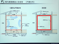 前述のように、イベントの会場は同社が作ったモデル試聴室。オーディオ的な音質に配慮した縦・横・天井高の比率を採用した上で、コンクリートの浮床構造、間柱の間にモルタルをつめることで厚く密度の濃い壁、幾重にもクラスターボードを重ねた天井など、重くしっかりした構造にしている。しっかり重くて振動の悪影響を受けないようにするというのはオーディオ機器にも通じる思想が興味深い。