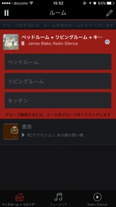 複数のHEOSがネットワーク上にあれば、互いに別々の音源を鳴らしたり、家中を同じ音楽ソースで満たすことも可能だ。ホームのメニューリスト左側にある「ルーム」アイコンをタップすると、同じネットワークの中にあるHEOSと再生されているソースがリストに表示される。グループ化したいHEOS同士をリスト上でドラッグ&ドロップすると、各HEOSに同じ音楽ソースが流れる。実際に試してみたが、同期再生の精度がとても高い。