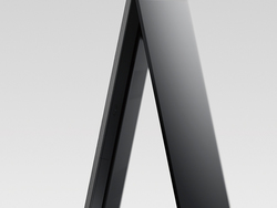 3つめのポイントはデザインの革新性である。一枚の板に映像を映し出すという究極のワンスレートコンセプトを掲げ、スタンドの存在を意識させないスタイリッシュな構造を工夫。