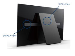 左右各2基ずつの小さなアクチュエーターでパネル全体の振動を励起し、背面スタンド内蔵のサブウーファーから再生する低音と組み合わせることによって画面からそのまま音が出る仕組みで、パネル内にバックライト機構が存在する液晶方式では真似できないOLEDパネルならではの技術である。