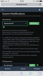 作業は簡単。WEBブラウザでMoode Audioの管理画面にアクセスし、「System Configuration」画面にあるLinux Kernel欄で「Advanced-LL」または「Advanced-RT」を選択、「INSTALL」ボタンをクリックしてしばらく待てばいい。数分すると再起動を促すダイアログが現れるので、指示どおりシステムを再起動すればOKだ。