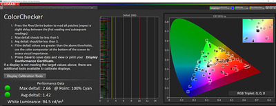 測定結果を解説するために、簡単に表の見方を説明しておこう。キャリブレーションソフトウェア「CalMAN」で、中間色を含む約100ポイントを測定した結果を示している。図中「CIE 1931 xy」の大きな三角形は人間が見る事のできる色の範囲で、内側の三角がBT.709の範囲を示している。その中で白い枠が測定のターゲット、色のついた丸印が実際の測定値をプロットしたもの。