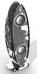 キャビネットは曲面を巧みに組み合わせた形状で、横から見るとほぼ楕円を構成、底部はそれだけで25sに及ぶ堅固なアルミブロック製ベースに連結され、140sを超える本体を支える。あらゆる面が曲面を構成することで反射や回折を抑えるとともに、微妙なカーブと傾斜で定在波を巧みに抑えていることにも注目したい。
