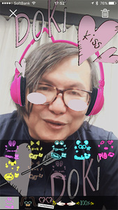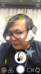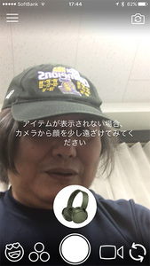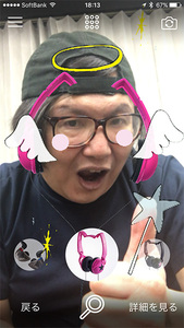 はしゃいでアプリを試す一条氏。お気に入りは猫耳ヘッドホンの様子。いろいろデコりはじめた。率直に言って気持ち悪い。