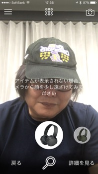 風間:そうです。カメラで顔を認識して、その角度も認識。それに3Dのヘッドホン映像を重ね合わせて表示することで、ホントに着けているような感じになります。さっそくやってみましょう。こんな感じです。