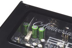 ADI-2 Pro Anniversary Editionは、同社創立20周年記念の世界限定500台。標準仕様との相違点は、筐体のカラーリングと、トップパネルがアクリルになって内蔵基板がそっくり見えるようになったこと、そして内部のイルミネーションだ。機能的にはまったく同一だが、アナログ入力端子部のシールドやフォーン出力ジャックの金メッキ仕様、吟味されたインシュレーターへの変更など、記念モデルにふさわしいグレードアップも盛り込まれている。
