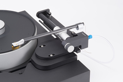 「Galder」の大きな特徴は、11.8sのアルミダイキャスト製プラッターをエアーポンプから送出されるエアーで浮かせ、さらにエアーポンプでレコードを吸着できることだ(吸着機構非搭載モデルも用意)。レコードをセットし、スタビライザーを置くと自動的にレコードの吸着を開始する(スピンドル軸中央の空気穴をスタビライザーで塞ぐと吸着する仕組み)。ターンテーブル部とモーター駆動部は微細振動を排除するために分離されているが、厚みのあるアルミ材底板でつながっている。