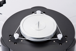 ではなぜ3基ものモーターを使用するのだろうか。ティエンオーディオによると、モーターは1基でも2基でもダメだそうで、それではサブプラッターの水平方向に対してベルトの力が均等ではなくなってしまい、バランスを崩してしまうためだ。3基のモーターが正三角形状のベルトを駆動し、その正三角形に内接する円であるところのサブプラッターを回転させることでパーフェクトな動作が得られるという。回転制御もCPUで行い、ワウフラッターは驚異的。このベルトもゴムではなくシリコンを採用するなど劣化の少ないものを採用し、長期にわたって安定した回転を実現することに配慮した。